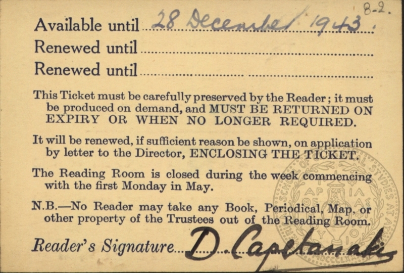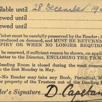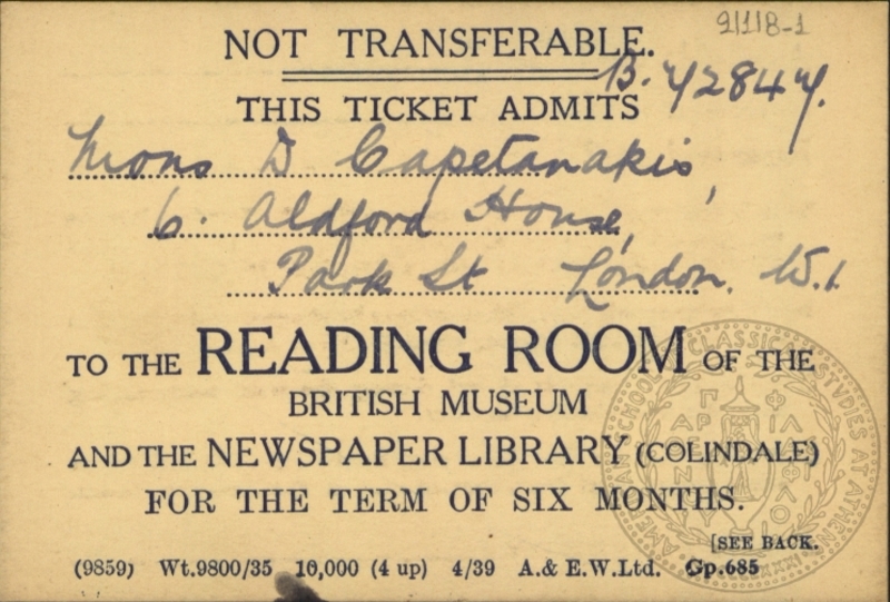: "Ticket to the reading room of the british museum and the newspaper library (colindale) for the term of six months"
