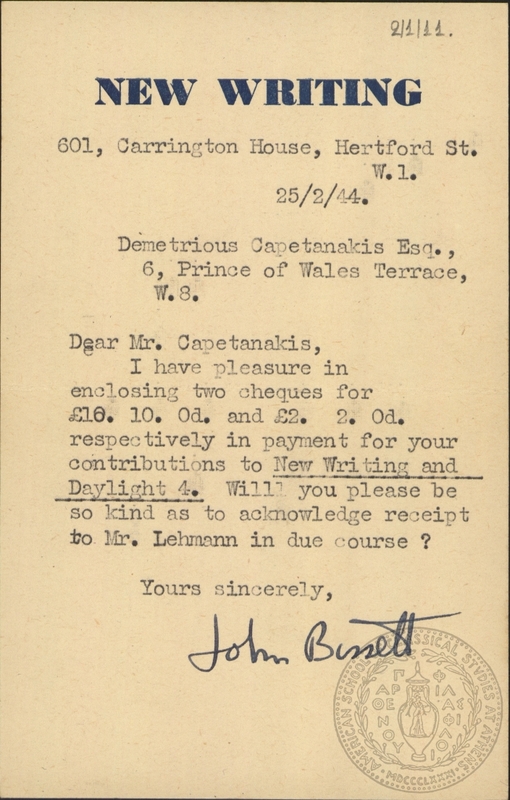 : "NEW WRITING letter regarding payment for contributions to New Writing and Daylight 4"