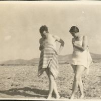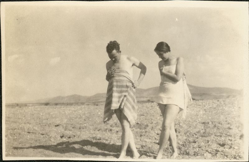 : "ASCSA students on the beach. Man and woman walking wrapped in towels."