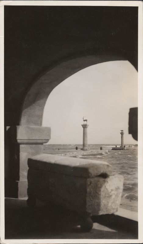Description: "One of the best pictures I think. Taken from the cloister of the new Italian Cathedral (called cloister of Sarcophagi) because many antique -and empty- sarcophagi are placed in the arches. Looking out of the entrance to the little Harbor. The Colossus pro"