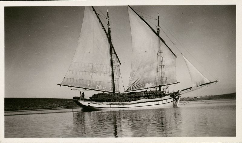 : "Fishing boat in full sail"