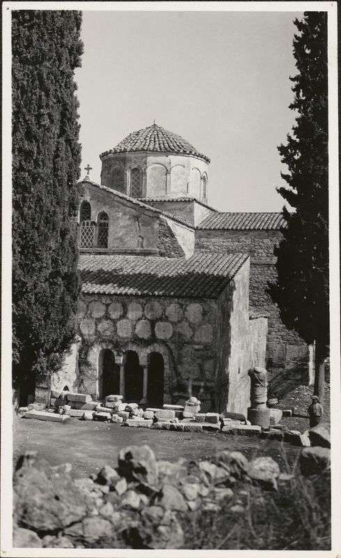 : "Mystras. Byzantine church framed by cypress trees"