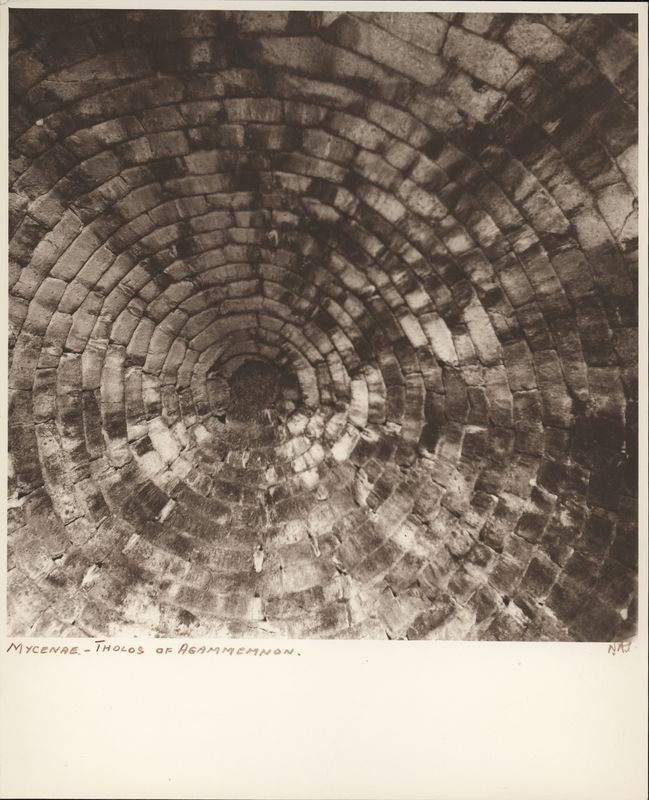 : "Mycenae- Tholos of Agamemnon. Tomb ceiling. Copyright 1888 V. & N. Tombazi Psychico Athens"