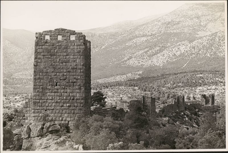 : "Orchomenos. Tower and fortified wall with mountains in the distance"