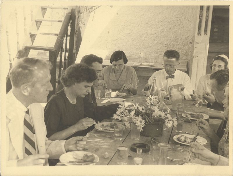 Description: "Wed. Sept. 19 (1952?) Farewell party at Agora for Bob and Nettie Miner RHH at left Alison Frantz Lucy Talcott Betty Dow, (see photo 0140)"