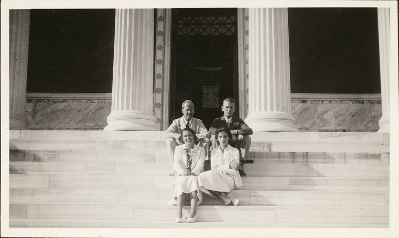Description: "1933 Connie Curry, Lillian Libman, Prof. Means and I on the steps of the Gennadion, one of the school bldgs. (save these pictures please)"