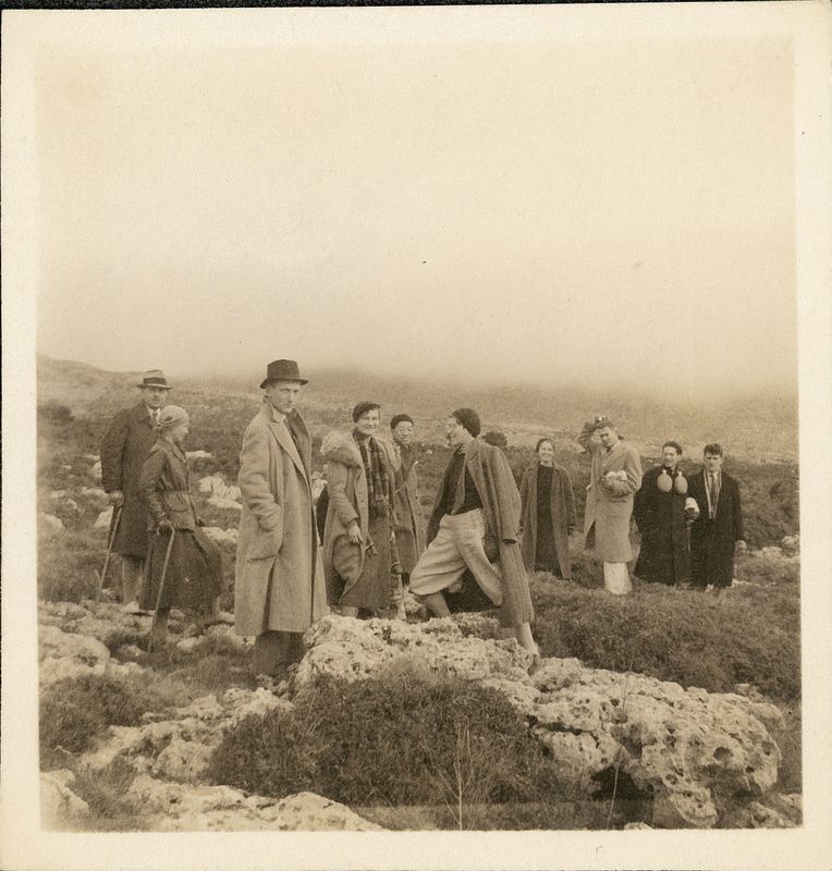 Title: "Oscar and Verna Broneer, R. Howland, W. Ruter, Mr Lo, G. Davidson, C. Gavaras, M. Johnson, R. Gould in the field"
