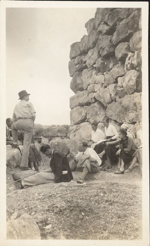 Description: "Here I am at Tiryns giving my lecture nochalantly to the awestruck multitube. Behind me, Mr. Broneer + Mrs Morgan. On the ground in front, Mr Lo and Mr Ayes. Leaning against the wall Martin, Dorothy, Mary E, Lillian and Winifred (just part of her showing) Will you please let Anne see this? (Sid took it)"