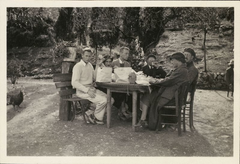 : "Martin H. Johnson, Lillian Libman, Richard H. Howland, Mao Te Lo, Mr. and Mrs. Means at lunch in Nemea."