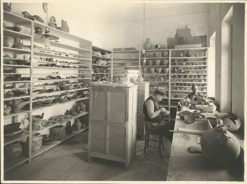 Athenian Agora Excavations. Mending room with workers mending pots.