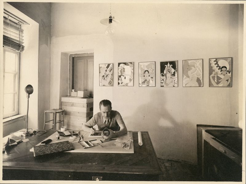 Description: ""Agora Piet de Young in his studio 1937? 1938? His caricatures on wall behind: ??? Mrs. T. Leslie Shear Libby Shear = Mrs. Sterling Dow Electra Mangoletsi Megaw (Mrs. Peter) ""Mangelwurzel""""