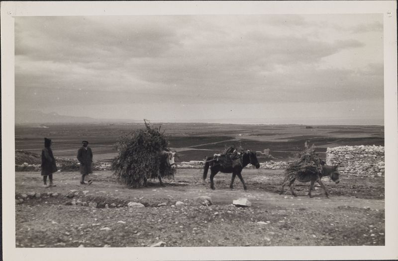 : "Horses carrying heavy load, plain in the background"