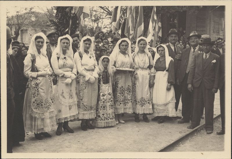 : "Lined up to greet the King Peloponnesos Morgan, Written on back. Two copies"