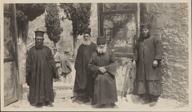 : "Chios. Priests and monks posing in front of the monastery's gate"
