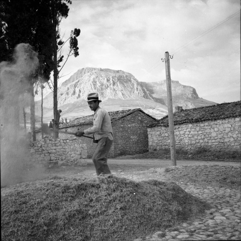 : "Old Corinth. Man threshing with Acrocorinth in the background"