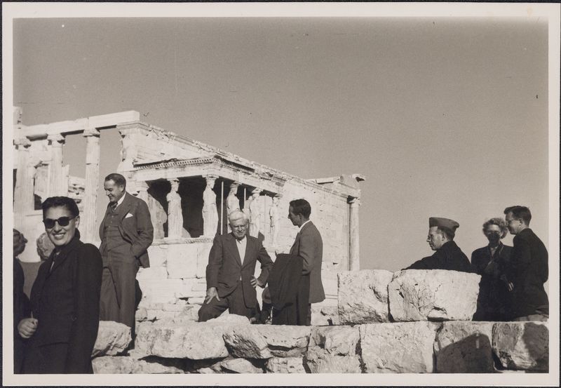 : "WB Dismoor lecturing on Acropolis GR Edwards Mabel Lang Gene Vanderpool, Written on back"