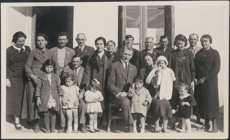 Description: "New Corinth - Baptism of E. lekkas 2d child Φωτινή R.H. Howland (the κουμπάρος) At his left Mrs Lekkaw with baby (Extreme left: Berta Segal) Behind Howland, the Lekkas brothers January 1936, Written on back"