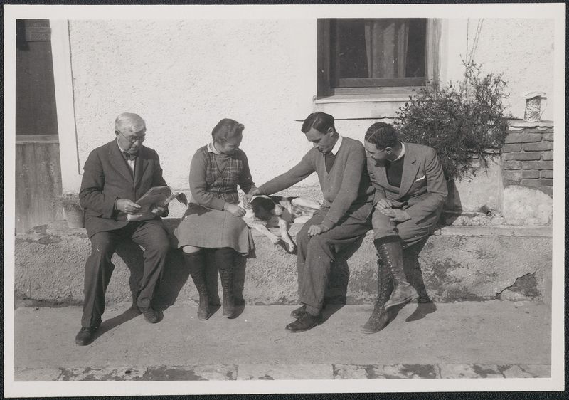 : ""Corinth L. to R: B.H, Hill, Josephine Harris ""Εθελοντής"", Wulf Schaefer, S. Weinberg Sunning after lunch", Written on back"
