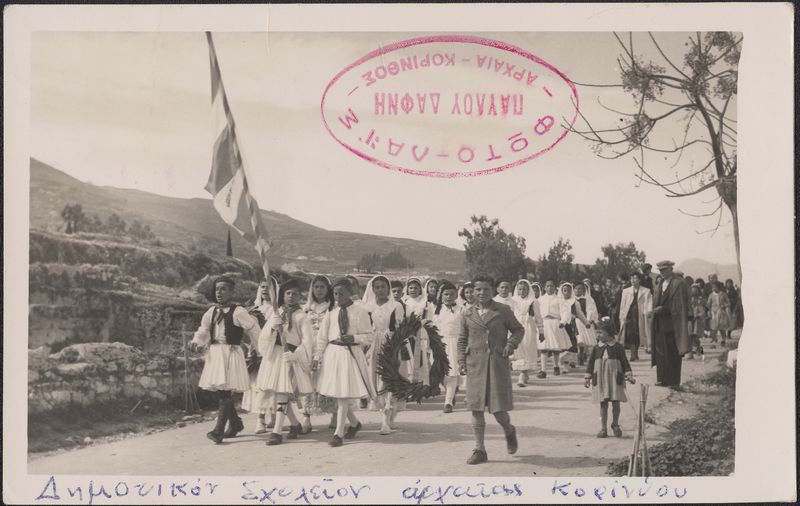 : "14 Δεκεμβρίου 1952 Π. Δάφνης Αρχαία Κόρινθος Χαιρετισμούς εις όλους, την Κυρίαν σας την σούζη, εις αδελφούς σας και εις Αδελφήν Κυρίαν σας. Με αγάπη Π. Δάφνης Παύλος, Βασιλική, Σαράντης, Αγγελική, Αναστασία, Αναστάσιος ΔΑΦΝΗ Σας εύχωνται Καλά Χριστούγεννα, Written on back"