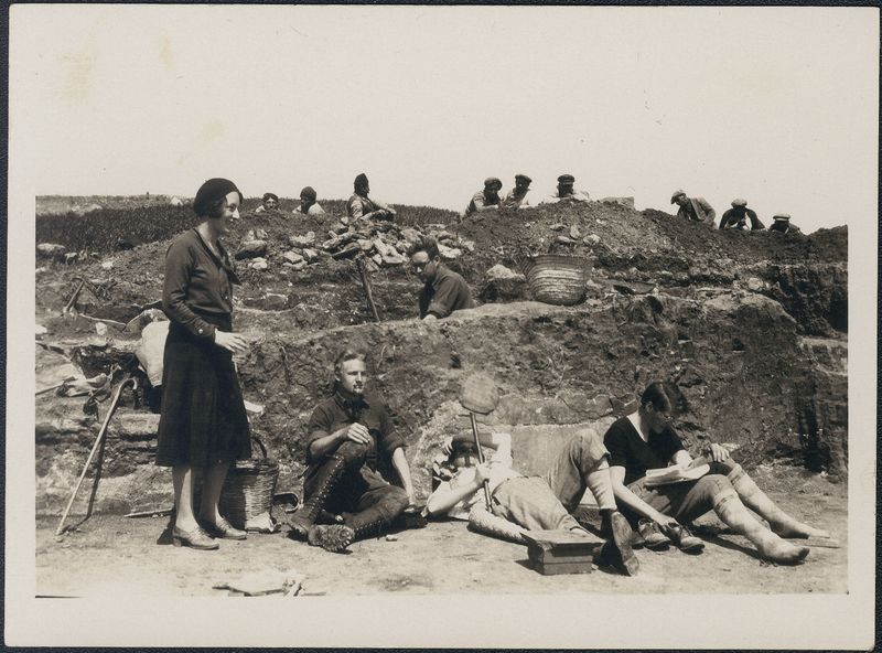 Description: ""Lunch at Sally's dig. Left to right: Mary, Alex, Walter, Mr. Mylonas, G.R.D. (reading the ""Nation"") workmen in the background", Written on back"