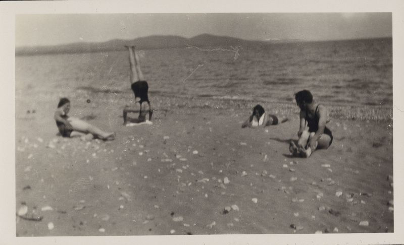: "On the beach Left to right Sally, Alex, Mary, Walter May 3, 1931, Written on back"