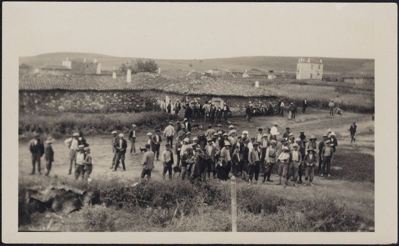Description: "Workmen waiting in front of our house, Myriophyto, to see if the weather woukd clear sufficiently for them to go back to work may 30, 1931, Written on back"