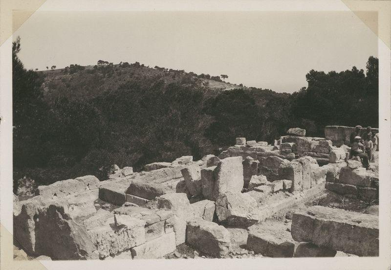 : "Aegina, buildings before you get to Temple of Athena 4/15/33 98, "On cardboard. On the back ""98""""