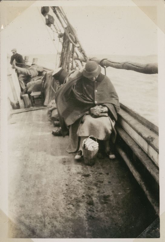 : "Woman sitting on deck of boat with head down"