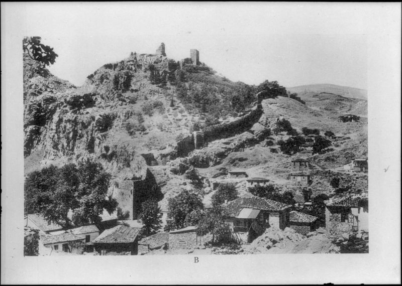 : "Village with fortified stone walls in the background"