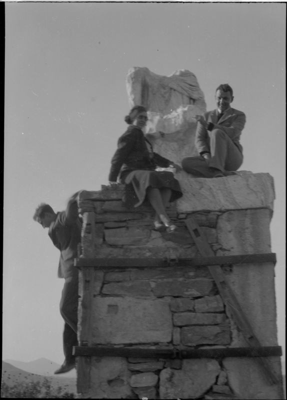 : "Porto Raphti : Gene, Rodney, Lucy on statue D 43, Written in pencil D 43"