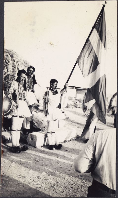 King Paul visits the Acropolis. Evzones with Greek flag.