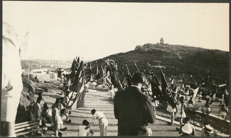 : "Aug. 4, 1936 King Paul visits the Acropolis, "On cardboard with title ""Aug. 4, 1936 King Paul visits the Acropolis"". Prince Paul?""