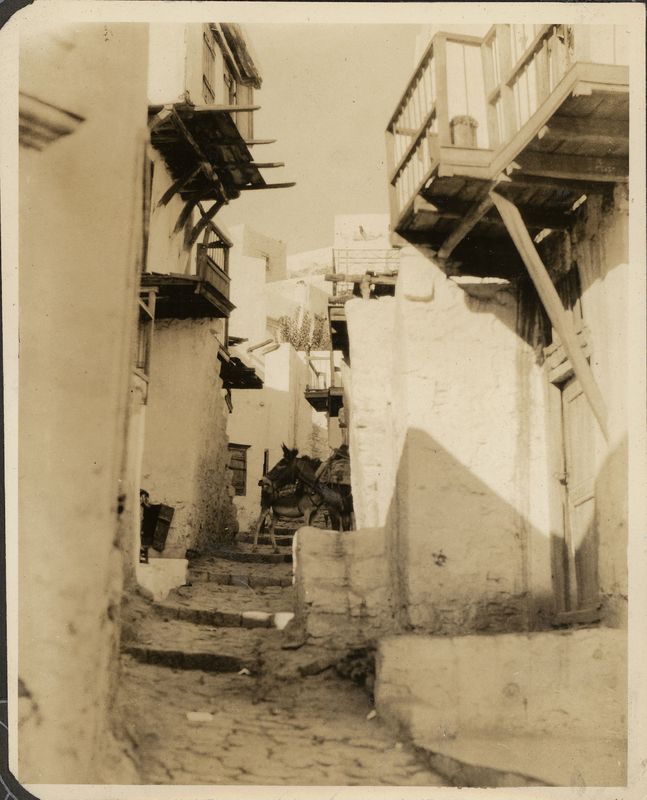 : "Skyros. Narrow, village street with overhanging baolconies"