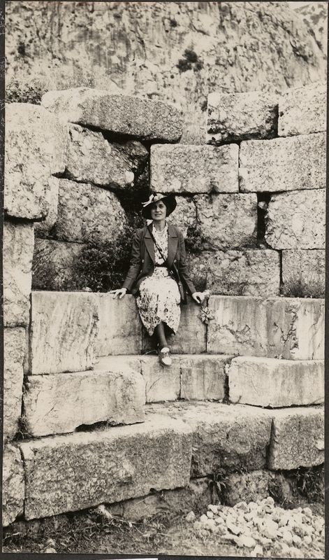 : "Delphi. Woman sitting on ruins in front of stone wall"