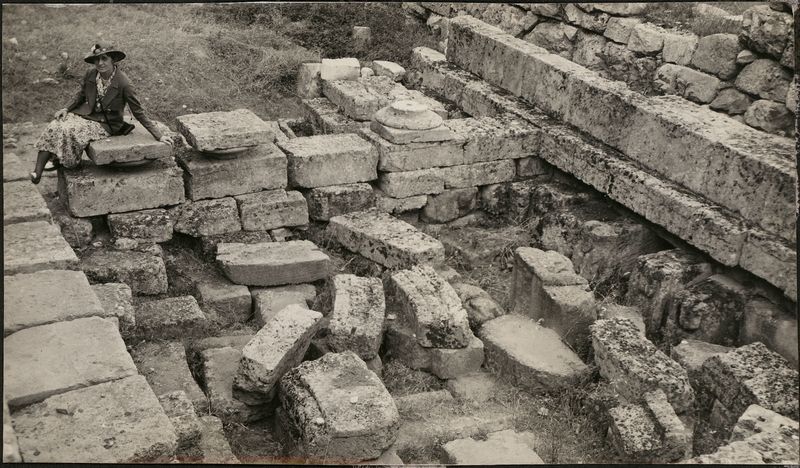 : "Delphi. Woman sitting on ruins"