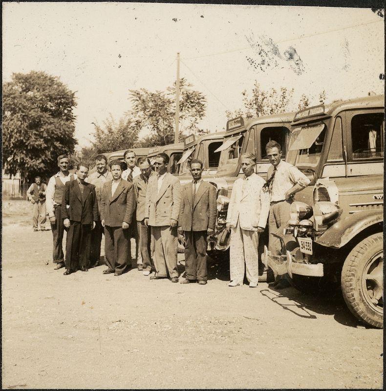 : "Thessaloniki. L.C. Zamvrecas and drivers of WILLYS buses"