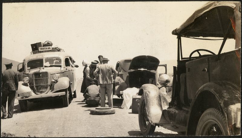 : "Flat tire that everyone helped fix, on the hot road to Larissa DCS Willys car-trunk open, On cardboard"