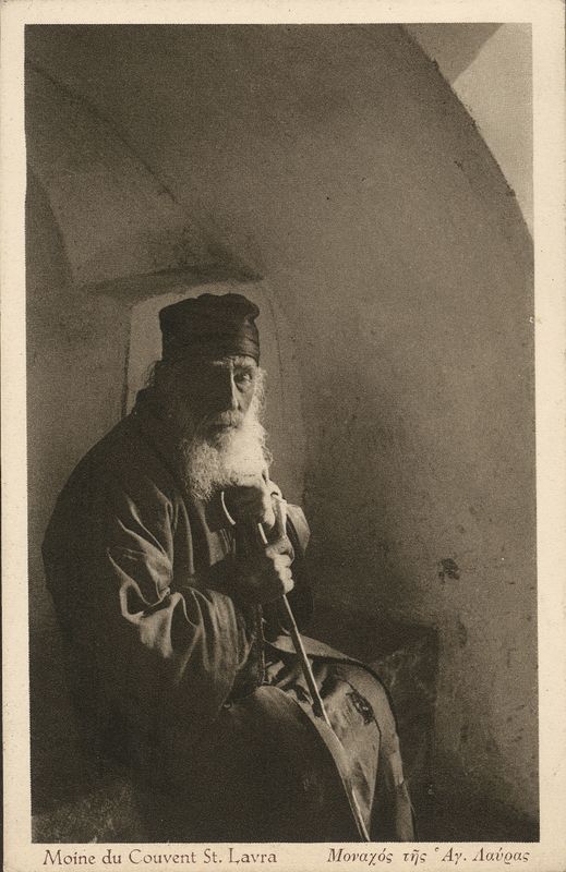 : "Moine de Couvent St. Lavra Μοναχός της Αγ. Λαύρας, "Postcard. On cardboard with title ""Mt. Athos""""