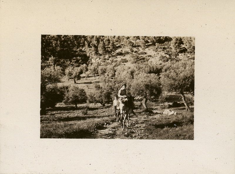 : "Aegosthena. Man riding a mule through an olive grove"