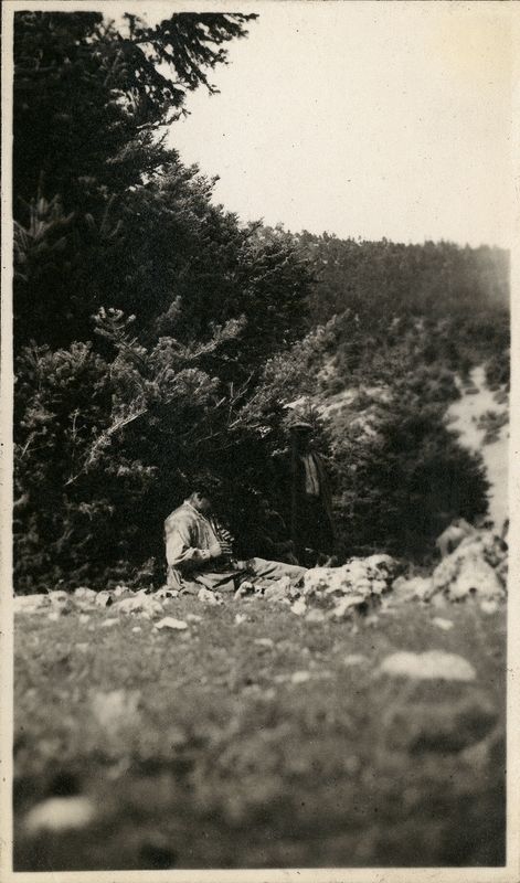 Description: "En route to Corycian Cave of Pan and the Nymphs 1937 Parnassos muleteer plays D.C.'s recorder, "On cardboard with title ""En route to Corycian Cave of Pan and the Nymphs 1937 Parnassos""""