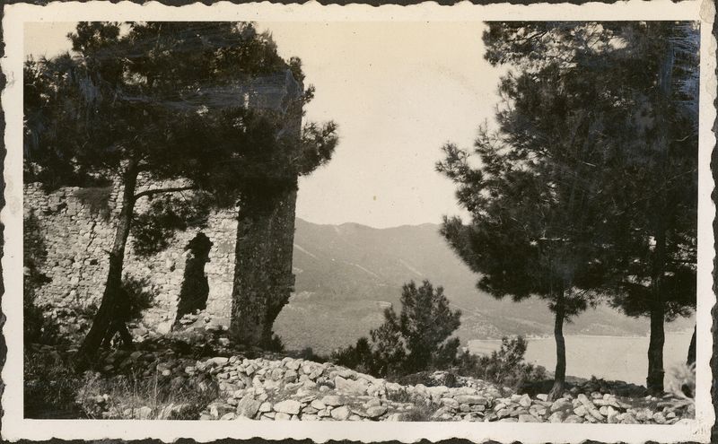 : "Thasos. Old, stone building with view of harbor below"
