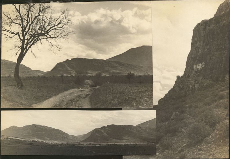 : "Phlious. Dirt road with mountains in the distance. From below cliff with monastery"
