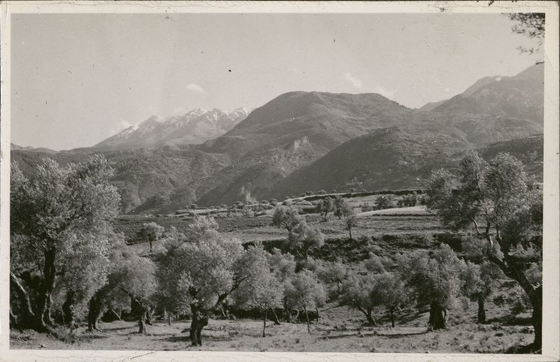 Description: "Wheat, oranges, olives and snowcapped mountains near Sparta, "On cardboard ""Wheat, oranges, olives and snowcapped mountains near Sparta""""