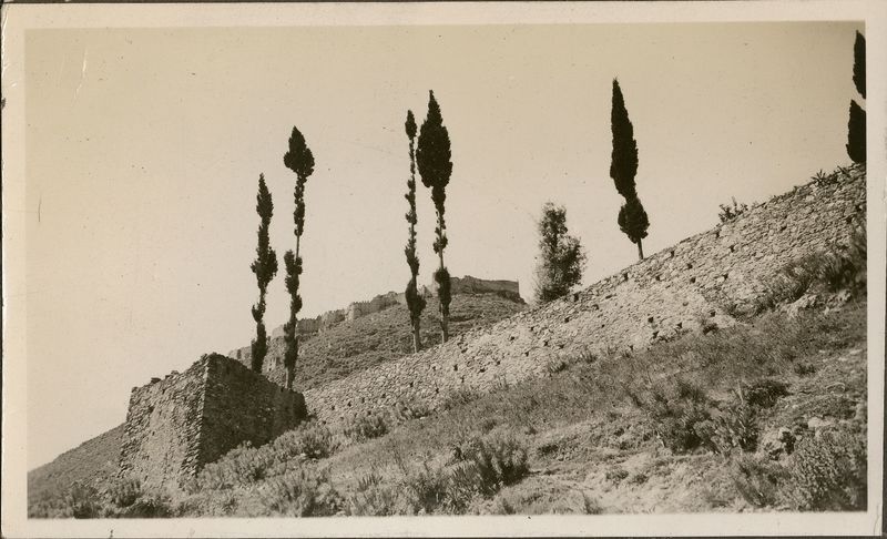 : "Mystras. Stonewall with watchtower and cyprus trees"