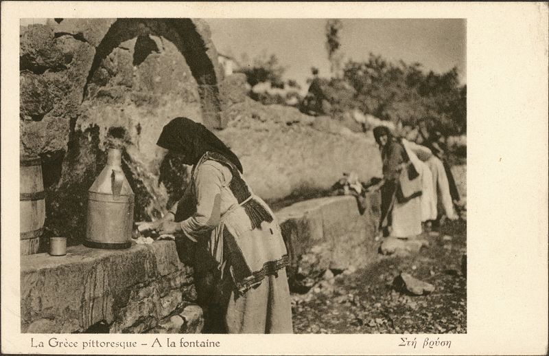 : "La Grece pittoresque - A la fontaine Στη βρύση, On cardboard. Postcard"