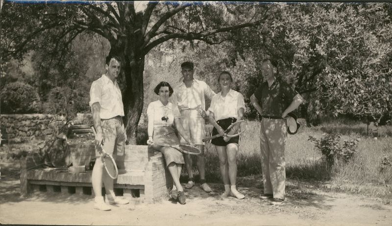 : "ASCSA/BSA Tennis court Ted Erck, Janet Morgan, ? Doreen C. & Ward Canaday, "On cardboard with title ""ASCSA 1937""""