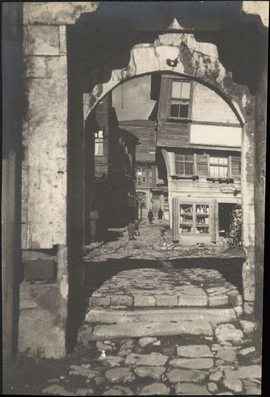 : "Small cobblestoned street seen through archway, houses with wooden second floor in Northern Greece"