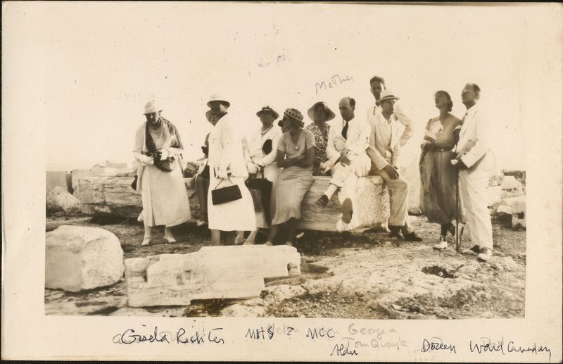 Description: "This represents a charming group at the Parthenon - note… ecstatic look on the coutenance of lady on the right of her father ! Tom looks a little sour but that is not because of me ! George and Tom Quayle 1936 members of Louis Lord's Aegean Cruise from D.C, Written in pencil, Gisela Rich[] MHS ? MCC Alan George + Tom Quayle Doreen Ward Canaday"