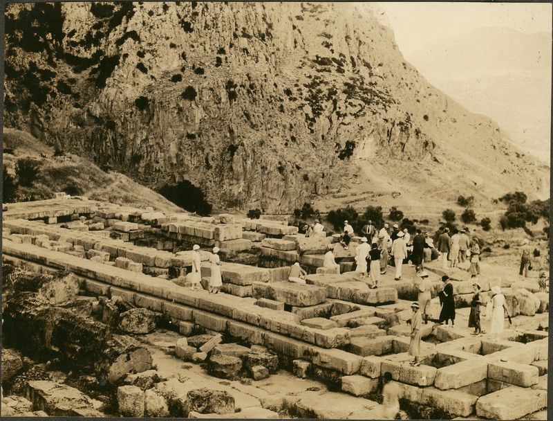 : "Delphi. Tourists/archaelogists in the ruins"