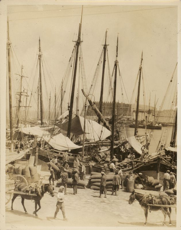 : "Rhodes. Harbor with cargo boats"